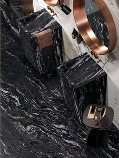 TITANIUM BLACK (Титаниум Блэк)– самый темный цвет. Это черный мрамор – самый редкий и дорогой представитель натурального камня. Рисунок поверхности – фантазийные горизонтальные разводы. Они меняют цвет в зависимости от освещения. При приглушенном свете становятся серебряными, в ярких лучах солнца – бежевыми. Такая плитка станет броским интерьерным акцентом любого помещения.
