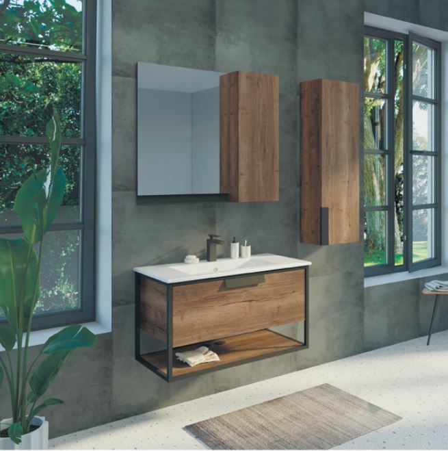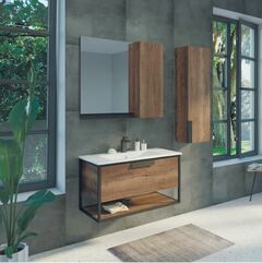 Мебель для ванной комнаты COMFORTY Подвесная тумба с одним выкатным ящиком, оснащенным системой плавного закрывания и нижней полкой открытого хранения. В основе тумбы - каркас из стального профиля окрашенный черной матовой эмалью. Профильная ручка из черного металла. Керамическая раковина Sanita Luxe Quadro 90 из санфарфора. Тумба подготовлена для подключения водоснабжения снизу.Варианты цвета корпуса и фасада: Дуб дымчатый или Дуб темный