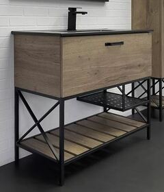 В комплекте черная матовая раковина с прямоугольной чашей. В основе тумбы - каркас из стального профиля окрашенный черной эмалью с нижней широкой полкой и средней полкой для полотенец. Стильная ручка ящика в том же цвете что и каркас. Тумба подготовлена для подключения водоснабжения снизу.