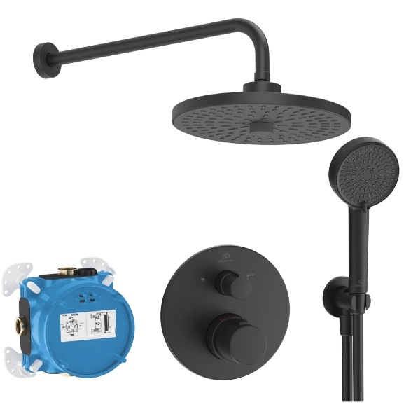 Комплект душевой системы скрытого монтажа немецкой фабрики IDEAL STANDARD с термостатом. Встраиваемая душевая система с тропическим душем состоит из следующих позиций: 2-х режимный верхний душ серии ALU+ из анодированного алюминия диаметром 26 см. Режим: Шелковистый дождь (особо мягкая струя) и Дождь. Переключение осуществляется поворотом ручки, расположенной в центре душа. Верхний душ поворотный, на шарнирном соединении.