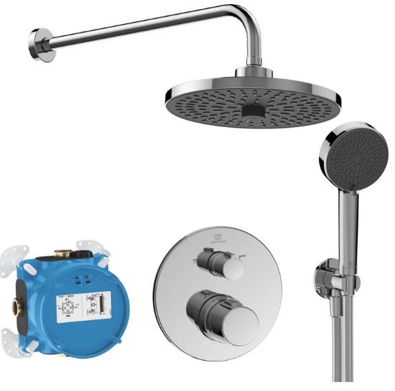 Комплект душевой системы скрытого монтажа немецкой фабрики IDEAL STANDARD с термостатом. Встраиваемая душевая система с тропическим душем состоит из следующих позиций: 2-х режимный верхний душ серии ALU+ из анодированного алюминия диаметром 26 см. Режим: Шелковистый дождь (особо мягкая струя) и Дождь. Переключение осуществляется поворотом ручки, расположенной в центре душа. Верхний душ поворотный, на шарнирном соединении.