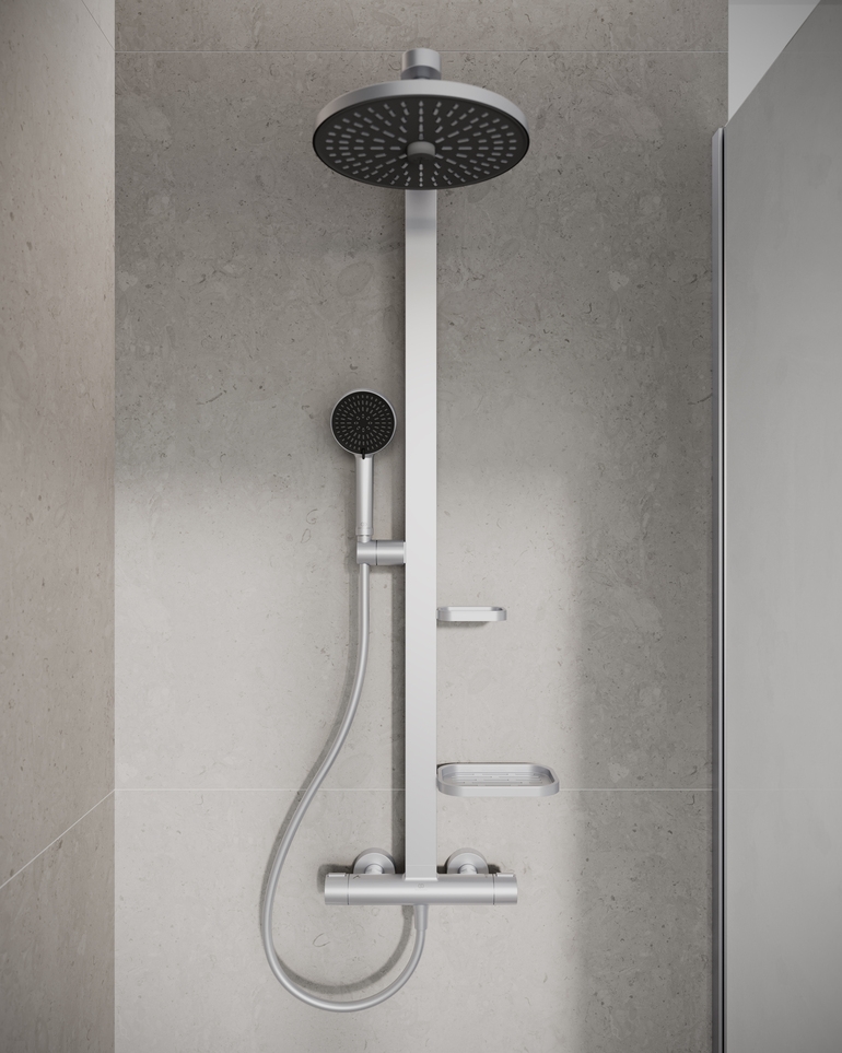 Душевая система доступна в следующих цветах: XG - черный матовый SI - серебристый (матовый хром) RO – розовое золото Серия ALU + это комплексное решение для ванной комнаты: в таком же стиле и цветовом решении есть аксессуары для ванной, смесители и душевая программа.