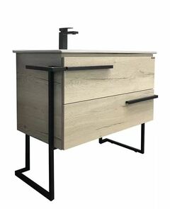 Напольная тумба с двумя ящиками оборудованными системой плавного закрывания. Фасады тумбы изготовлены из влагостойкого ДСП, созданного по уникальной технологии «Синхронное тиснение» в декоре «дуб В комплекте асимметричная раковина с широким правым "крылом". В основе тумбы - каркас с полотенцедержателем из стального профиля окрашенный черной эмалью. Каркас дополняют ручки ящиков выполненные в едином стиле.