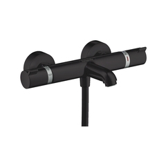 Термостат для ванны (с изливом) немецкой фабрики HANSGROHE в черном матовом цвете. Термостат обеспечивает постоянную температуру воды вне зависимости от перепадов давления в системе. Принцип управления: ручка с одной стороны выставляет нужную температуру воды (в среднем положении комфортные 38-40°), ручка с другой стороны включает воду, регулирует напор, переключает на ванну или душ. Термостат не нагревает и не охлаждает воду, термостатический картридж перераспределяет поток воды. Аэратор расположен под углом 20°, что обеспечивает удобное направление струи (дополнительно вперед на 2-4 см). От стены длина излива до центра аэратора составляет 177 мм. Силиконовый аэратор QuickClean не создаёт брызг и легко чистится от извести. Расход воды составляет 18,6 л/мин. Для термостата обязательно стандартное расположение воды - горячая вода слева, холодная - справа. Для корректной работы термостата рекомендована установка регуляторов давления воды, чтобы разница между холодной и горячей водой составляла не более 0,5 бара. Ручной душ в комплект не входит.