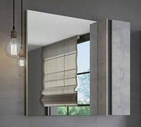 Створка оснащена системой push-to-open (открытие при нажатии). Высококачественное зеркальное полотно с амальгамой на основе серебра. Фасад и корпус из влагостойкого ЛДСП Бетон светлый. За створкой две горизонтальные полки.