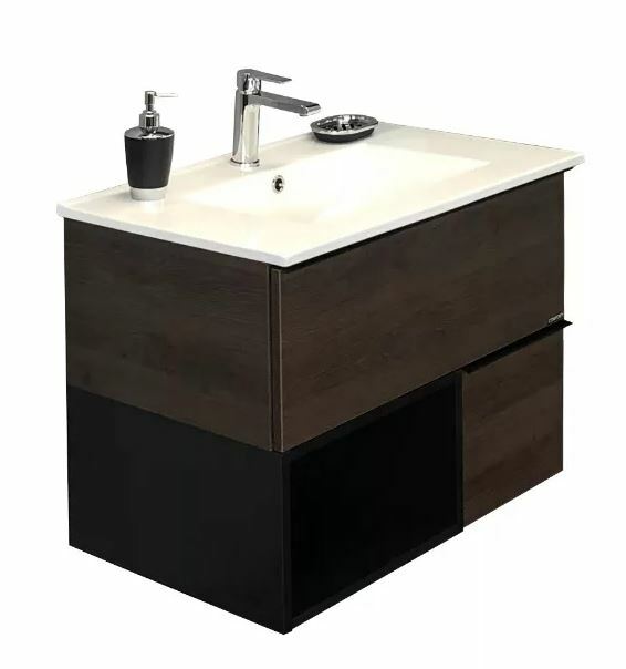 Тумба-умывальник в современном стиле с двумя выкатными ящиками и пространством для открытого хранения. Ящики оснащены системой плавного закрывания. Тумба укомплектована черными матовыми алюминиевыми ручками и столешницей и накладной прямоугольной раковиной из санфарфора.