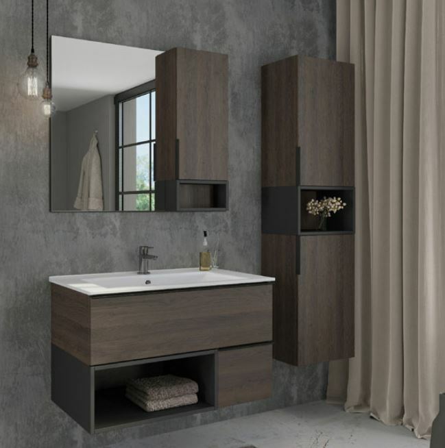 Мебель для ванной комнаты COMFORTY подвесная тумба с двумя ящиками оборудованными системой плавного закрывания и пространством для открытого хранения. На ящиках тумбы черные матовые алюминиевые ручки.