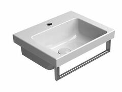 Раковина с переливом, отверстия для смесителя пробиты. Полотенцедержатель - опция по желанию, приобретается дополнительно.