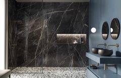 В коллекции предлагается фоновая плитка мраморного дизайна шести цветов и фоновая плитка с стиле террацо еще в пяти вариантах цвета: