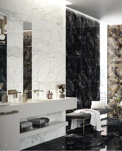 Поскольку основное назначение коллекции – внутренние помещения, фабрика решила выпускать коллекцию исключительно в полированном (lappato) варианте исполнения. Полированная поверхность придает особую глубину цвета и подчеркивает элегантность рисунка мрамора. Цветовые переходы становятся более выраженными, а "трещины" и цветные вены заметнее. Второй аспект – это предназначение плитки из серии NAXOS RHAPSODY преимущественно для интерьеров квартир и частных домов. По этой причине коллекция предлагается в двух основных форматах – 60х60 и 60х120 при толщине плитки 7 мм. Для внутренних приватных интерьеров такой толщины вполне достаточно и позволяет с легкостью использовать плитку как для укладки на пол, так и для облицовки стен, а небольшой формат позволяет легко адаптировать дизайн как к сложным поверхностям небольших помещений, так и к весьма просторным.
