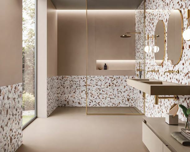 В коллекции предлагается фоновая плитка мраморного дизайна шести цветов и фоновая плитка с стиле террацо еще в пяти вариантах цвета: