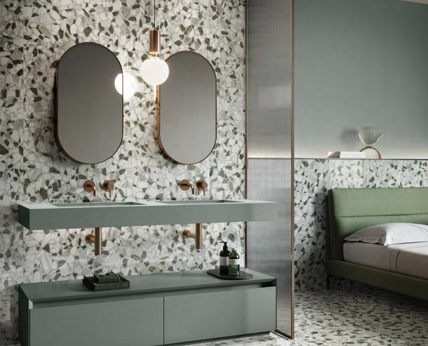 В коллекции предлагается фоновая плитка мраморного дизайна шести цветов и фоновая плитка с стиле террацо еще в пяти вариантах цвета: