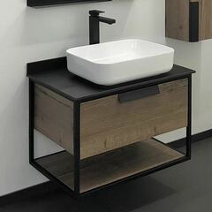 Подвесная тумба-умывальник в стиле лофт с одним выкатным ящиком оснащенным системой плавного закрывания и нижней полкой открытого хранения. В основе тумбы - каркас из стального профиля окрашенный в цвет черный муар.