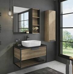 Подвесная тумба-умывальник в стиле лофт с одним выкатным ящиком оснащенным системой плавного закрывания и нижней полкой открытого хранения. В основе тумбы - каркас из стального профиля окрашенный в цвет черный муар.