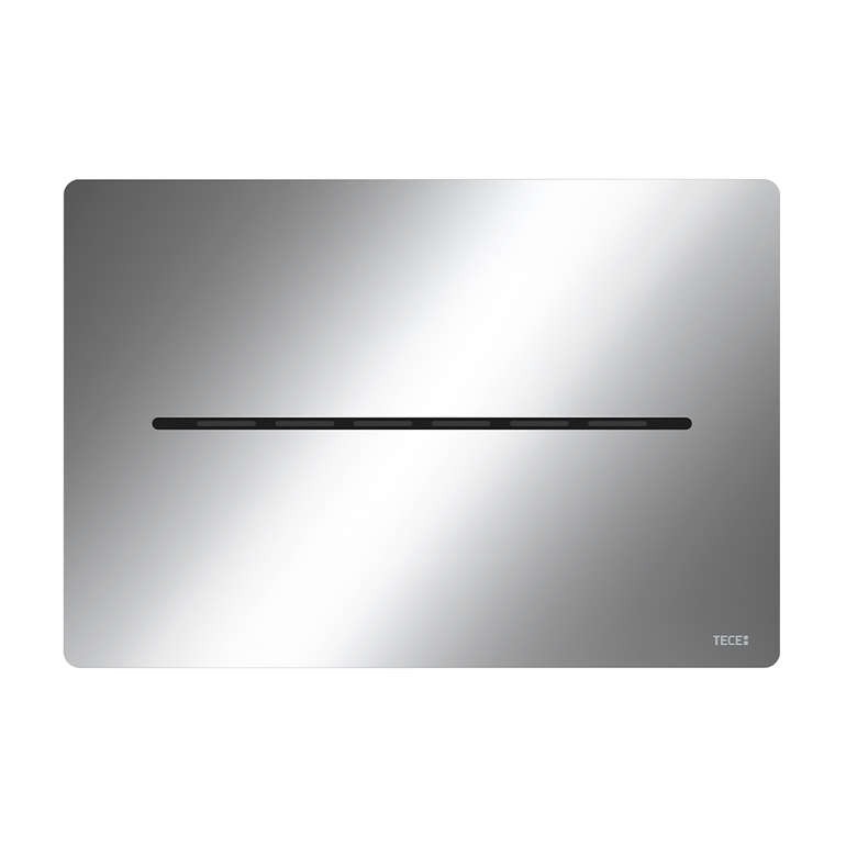 Электронная панель смыва с гигиеничной бесконтактной активацией смыва для стандартных бачков ТЕСЕ (глубиной 13 см) с фронтальной активацией и высотой высотой установки около 1 м (центр панели смыва). Плоская панель из нержавеющей стали в комплекте с крепежными элементами, герметичным отсеком для батарей для установки внутри бачка (4 батареи тип Mono/D/LR 20) и электроприводом смыва для систем двойного смыва. Совместима с контейнером для гигиенических таблеток.