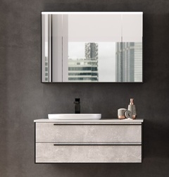 Комплект мебели GRACE выпускается в трех размерах: 70 см, 100 см, 150 см (с двойной раковиной). Доступно 2 цвета на выбор: Light Concrete (светло серый), Halifax Oak (фактура дерева дуб).