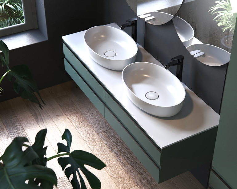 Мебель комплектуется раковиной на выбор: Овальная раковина чаша Soft 55*36 см или круглая Soft диаметром 38 см, Раковина чаша серии LUX 50*36 см или круглая LUX диаметром 38 см. Раковина из композитного материала KERROCK (состоит из гидроксида алюминия и связующих полимеров на основе акрила). Материал на ощупь напоминает теплый камень, легко чистится и не желтеет со временем. Материал непористый - не впитывает загрязнения и красящие вещества, ничего не выделяет при контакте с водой, имеет однородную структуру по всей толщине раковины. Поверхность раковины устойчива к химикатам и механическим повреждениям.