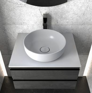 Мебель комплектуется раковиной на выбор: Овальная раковина чаша Soft 55*36 см или круглая Soft диаметром 38 см, Раковина чаша серии LUX 50*36 см или круглая LUX диаметром 38 см. Раковина из композитного материала KERROCK (состоит из гидроксида алюминия и связующих полимеров на основе акрила). Материал на ощупь напоминает теплый камень, легко чистится и не желтеет со временем. Материал непористый - не впитывает загрязнения и красящие вещества, ничего не выделяет при контакте с водой, имеет однородную структуру по всей толщине раковины. Поверхность раковины устойчива к химикатам и механическим повреждениям.