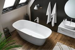 Отдельностоящая ванна из композитного материала KERROCK (состоит из гидроксида алюминия и связующих полимеров на основе акрила). Материал на ощупь напоминает теплый камень, легко чистится и не желтеет со временем. Материал непористый - не впитывает загрязнения и красящие вещества, ничего не выделяет при контакте с горячей водой, имеет однородную структуру по всей толщине ванны. Поверхность ванны устойчива к химикатам и механическим повреждениям.
