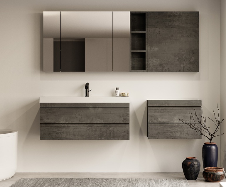 В коллекция NAOMI есть открытые и закрытые пеналы разных размеров, подвесные шкафчики, зеркала и зеркальные шкафы.