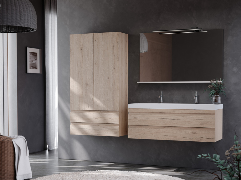 Комплект мебели NAOMI выпускается в следующих размерах: 50 см, 60 см, 70 см, 80 см, 100 см, 120 см. Доступно 3 цвета на выбор: White (белый матовый), Natural Wood (фактура дерева), Dark Concrete (серый бетон).
