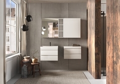 В коллекция NAOMI есть открытые и закрытые пеналы разных размеров, подвесные шкафчики, зеркала и зеркальные шкафы.