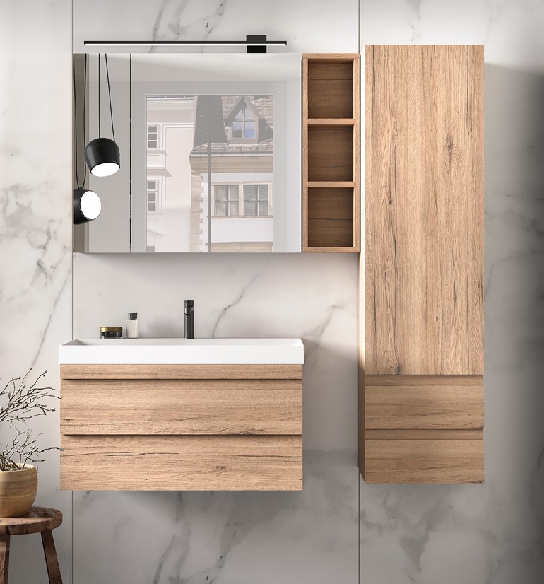 В коллекция NAOMI есть открытые и закрытые пеналы разных размеров, подвесные шкафчики, зеркала и зеркальные шкафы.