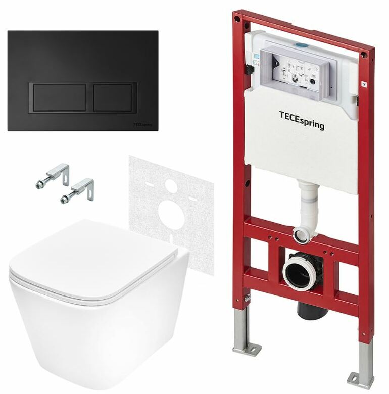 В комплекте ВЫГОДНЕЕ! Получите дополнительную скидку 10% при покупке инсталляции вместе с унитазом TECE SPRING. Комплект поставки: Инсталляция для подвесного унитаза базовой линейки TECESpring Клавиша смыва TECE Spring черный матовый Безободковый унитаз TECE Spring Model S. Подвесной унитаз имеет вихверой смыв торнадо, в комплекте тонкая крышка-сиденье Slim с плавным опусканием, металлические петли, быстросъемная.