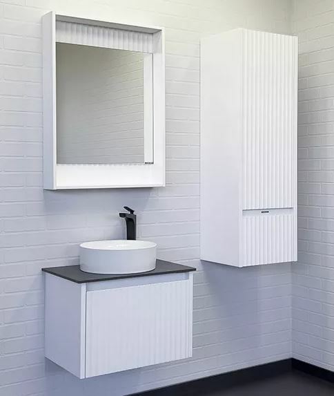 Фасад тумбы из МДФ фрезерован геометрическим узором с имитацией волны и окрашен белой матовой эмалью.
