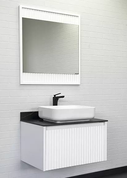 Фасад тумбы из МДФ фрезерован геометрическим узором с имитацией волны и окрашен белой матовой эмалью.