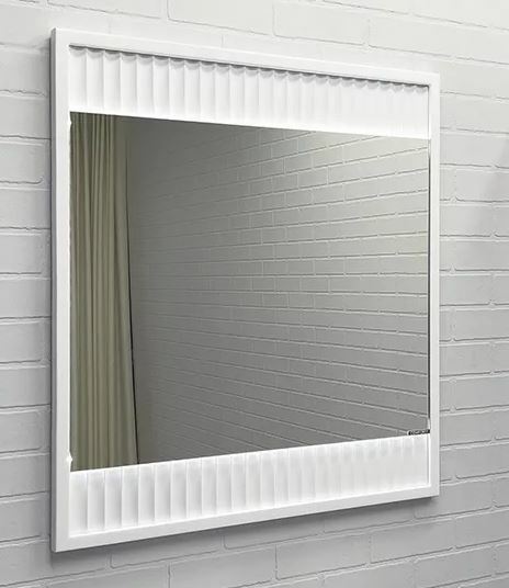 Зеркальное высококачественное полотно с амальгамой на основе серебра. Основа зеркала из МДФ фрезерована геометрическим узором с имитацией волны и окрашена белой матовой эмалью. Зеркало оборудовано светодиодной подсветкой с включением/выключением бесконтактным сенсором.