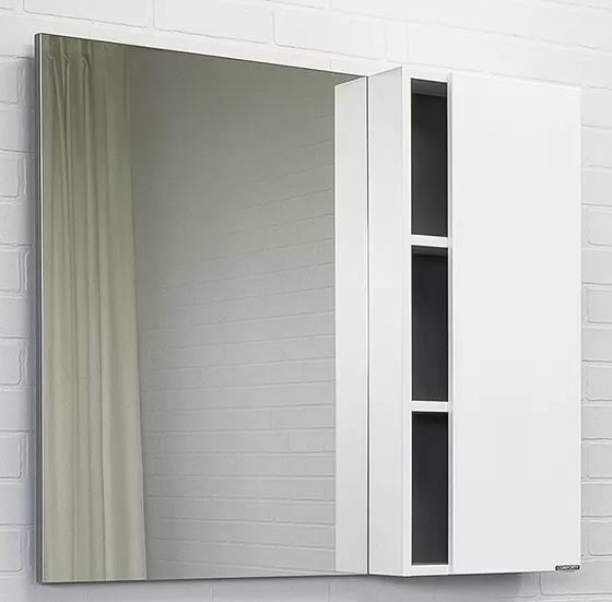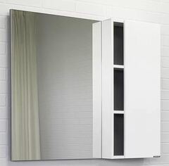 Зеркало-шкаф с одной створкой и пространствами для открытого хранения. Створка оснащена системой плавного закрывания. Две горизонтальные полки продолжаются и за створкой.