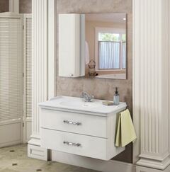Подвесная тумба с двумя широкими выкатными ящиками оснащенными системой плавного закрывания. Оригинальные эргономичные ручки. Тумба укомплектована раковиной столешницей с овальной чашей. Раковина с одним отверстием под смеситель, есть разметка под установку смесителя на три отверстия.