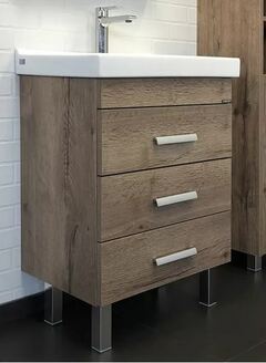 Напольная тумба с тремя выдвижными ящиками, оснащенным системой плавного закрывания и хромированными ручками. Корпус и фасады тумбы изготовлены из влагостойкого ДСП, созданного по уникальной технологии «Синхронное тиснение» в декоре «дуб темный». Этот декор при прикосновении дарит ощущение натуральной древесины. Тумба подготовлена для подключения водоснабжения снизу.