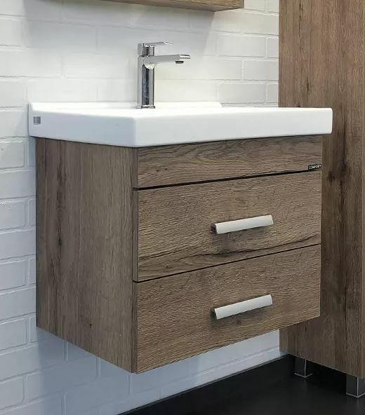 Тумба с двумя выдвижными ящиками, оснащенным системой плавного закрывания и хромированными ручками. Тумба подготовлена для подключения водоснабжения снизу. Название: Тумба-умывальник подвесная