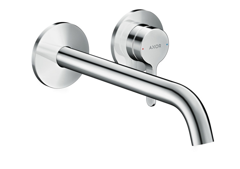 Встраиваемый смеситель для раковины AXOR ONE, дизайн Barber Osgerby Встраиваемый смеситель для раковины из стены. Длина излива до центра аэратора 220 мм. За счет расположения аэратора под углом струя бьет вперед, что обеспечивает комфортное мытье рук.