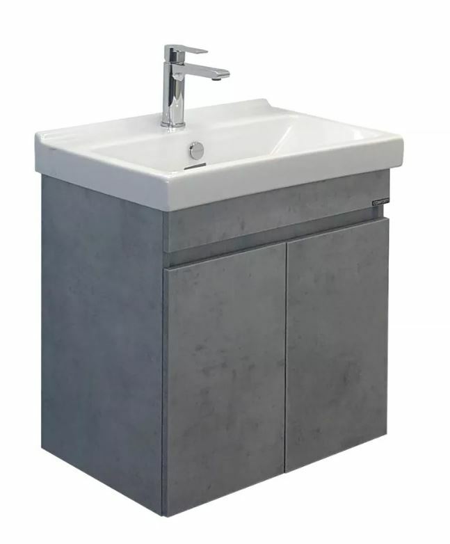 Подвесная тумба-умывальник с двумя распашными дверцами. Створки оборудованы петлями с механизмами плавного закрывания. Корпус и фасады из влагостойкого ЛДСП с декором "бетон светлый". Тумба укомплектована керамической раковиной и подготовлена к подключению коммуникаций из стены и из пола.