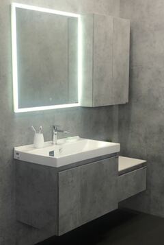Подвесная тумба-умывальник шириной 80 см с распашной дверцей и глубоким выдвижным ящиком для хранения принадлежностей для умывания и бытовой химии. Петли створки и направляющие ящика оснащены механизмами плавного закрывания. Фасады и корпус из влагостойкого ЛДСП цвета бетон светлый.