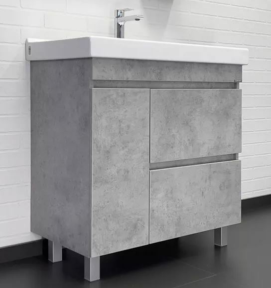 Современная тумба-умывальник с большим выбором пространств для хранения принадлежностей для умывания и бытовой химии. Тумба с одной створкой и двумя ящиками. Створка оснащена петлями с плавным закрыванием. Фасады и корпус из влагостойкого ЛДСП цвета бетон светлый.