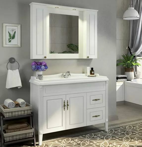 Широкая - 120 см - тумба-умывальник с двумя створками и двумя ящиками. Петли створок и направляющие ящиков оснащены механизмами плавного закрывания. Фасады с фрезеровкой, окрашены белой глянцевой эмалью. Ножки из массива дерева. За створками одна горизонтальная полка.