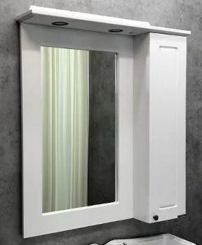 Зеркало-шкаф в стиле прованс с мебельным элементом справа. Рама зеркала и шкаф выполнены из МДФ и покрыты белой глянцевой эмалью. Створка оборудована петлями с системой плавного закрывания.