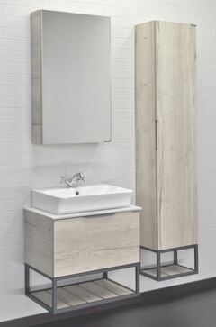 Подвесная тумба-умывальник с одним выкатным ящиком оснащенным системой плавного закрывания и нижней полкой открытого хранения. В основе тумбы - каркас из стального профиля. Тумба выпускается в следующих сочетаниях: ВЛДСП - Дуб темно коричневый, каркас - черный муар, черный керамогранит; либо ВЛДСП - дуб дымчатый, каркас - серый графит, белый керамогранит.