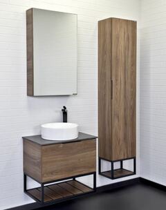 Подвесная тумба-умывальник с одним выкатным ящиком оснащенным системой плавного закрывания и нижней полкой открытого хранения. В основе тумбы - каркас из стального профиля. Тумба выпускается в следующих сочетаниях: ВЛДСП - Дуб темно коричневый, каркас - черный муар, черный керамогранит; либо ВЛДСП - дуб дымчатый, каркас - серый графит, белый керамогранит.