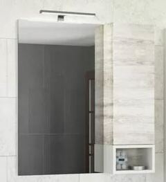 Створка оснащена системой push-to-open (открытие при нажатии). Высококачественное зеркальное полотно с амальгамой на основе серебра. Дополнительно оснащается светильником. Фасад и корпус из влагостойкого ЛДСП Дуб Белый.