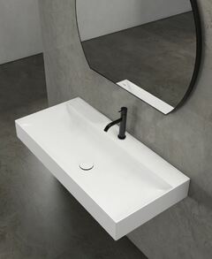 Подвесная раковина крепится к стене, ее можно комбинировать с тумбой или столешницей. Раковина поставляется с 1 отверстием для смесителя по центру раковины. Донный клапан с керамической накладкой (универсальный белый или в цветном исполнении) – опция по желанию и заказывается дополнительно.