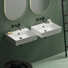 Подвесная раковина крепится к стене, ее можно комбинировать с тумбой или столешницей Раковину можно установить на столешницу как чашу или сделать комбинацию с тумбой под раковину. По умолчанию раковины поставляются без отверстий для смесителя (подходят для настенных смесителей). При необходимости размеченное на фабрике отверстие пробивается - при заказе уточните необходимость отверстий и их количество. Хромированный полотенцедержатель – опция по желанию, приобретается дополнительно. Раковина долго остаётся чистой за счёт грязеотталкивающего покрытия Cataglaze. Для уборки не рекомендуется применять агрессивные чистящие средства, достаточно бережного ухода на основе лимонной кислоты. Визуально керамика Catalano выглядит белее остальных производителей за счёт более низкого содержания железа в эмали. Для производства сантехники Catalano используется постоянный состав исходного сырья на базе высококачественный каолина, что обеспечивает ровную поверхность керамики, четкие углы и тонкостенные борта. Раковина доступна в 3 цветах.