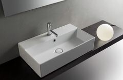 Подвесная раковина крепится к стене, ее можно комбинировать с тумбой или столешницей. Раковина поставляется с 1 отверстием для смесителя по центру раковины. Донный клапан с керамической накладкой (универсальный белый или в цветном исполнении) – опция по желанию и заказывается дополнительно.