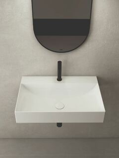 Подвесная раковина крепится к стене, ее можно комбинировать с тумбой или столешницей. Раковина поставляется с 1 отверстием для смесителя по центру раковины. Донный клапан с керамической накладкой (универсальный белый или в цветном исполнении) – опция по желанию и заказывается дополнительно.
