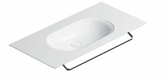 Подвесная раковина крепится к стене (крепеж в комплекте), ее можно комбинировать с открытой консолью или тумбой. Хромированный полотенцедержатель – опция по желанию, приобретается дополнительно.