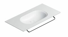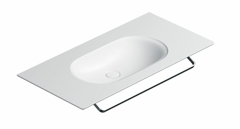 Подвесная раковина крепится к стене (крепеж в комплекте), ее можно комбинировать с открытой консолью или тумбой. Хромированный полотенцедержатель – опция по желанию, приобретается дополнительно.